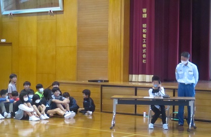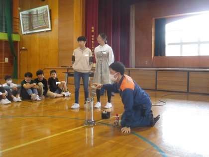 少年消防クラブの一員になりました。安全帽子にバッジを付けて、みんな張り切っています。119番通報の練習を行ったり、爆発実験を見たりして、学びの多い時間となりました。