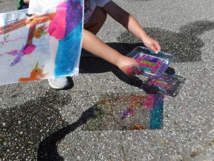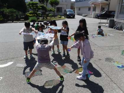 図画工作科で「ひかりのプレゼント」の学習をしました。透明な容器やクリアファイルにマジックで絵を描き、光を通して地面に映してみました。とても晴れていた日だったので、はっきりと映り、子供たちはとても嬉しそうに見ていました。また、容器に水を入れると、影が揺らめき、幻想的な様子にうっとりしていました。