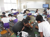 理科では、植物の発芽の条件等について学習しています。発芽した後、子葉がしぼんでいくことから、子葉には栄養が含まれているのではないかと考え、ヨウ素液を使って調べました。ヨウ素液がでんぷんに反応する様子を、目を輝かせながら観察している様子が見られました。