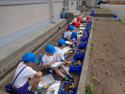 朝顔の芽がでてきたので、観察をしました。「種のぼうしをかぶっている」「葉っぱがハートの形に見える」など、たくさんつぶやきながら、カードをかきました。次はどんな変化が見られるのか楽しみです。