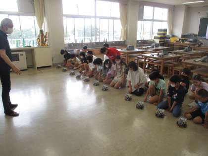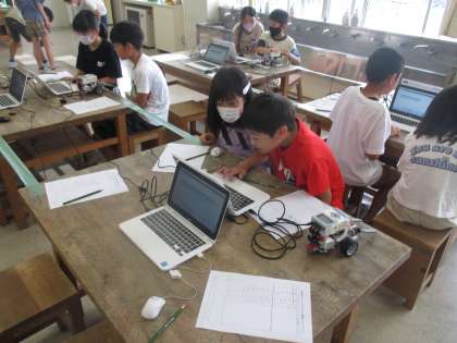 今日は、自走式ロボットを使ったプログラミング講座がありました。コンピュータを使った本格的なプログラミングを学んだ後、ロボットの動きをプログラムしました。自分たちがプログラムした通りにロボットが動いたときには大きな歓声が上がっていました。