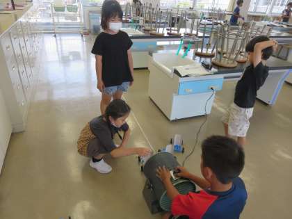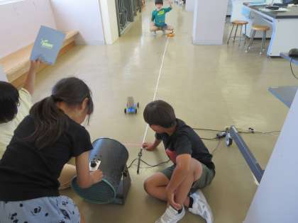風の力で車を走らせました。送風機を使って、風の強さを変えて実験しました。周りの窓を閉めたり、送風機の角度を統一したりするなど正確に結果を出そうとしていました。