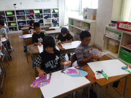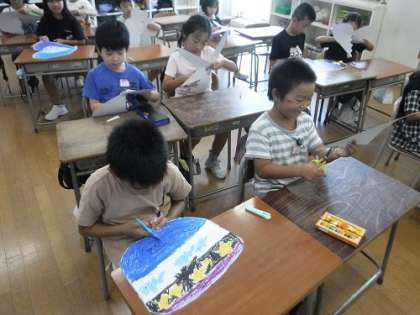 1学期にふしぎなたまごの絵を描いてから2ヶ月、じっくりと温めてきました。たまごがわれ、中身が飛び出しました。子供たちは、ふしぎなたまごからどんな世界が飛び出すかをじっくりと考えて、描き始めました。完成するのが楽しみです。