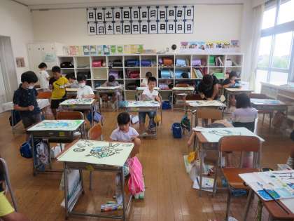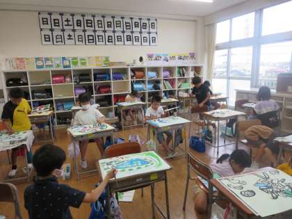水の中の不思議な生き物を想像して描いています。絵の具を混ぜて同系色の色をたくさん作って塗りました。元の色に黒色や白色を加えたり、水の量を変えたりすることが上手になってきました。