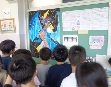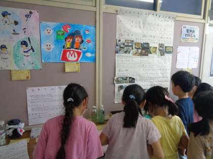 全校の、夏休みの作品を見に行きました。素敵な作品がたくさんあり、子供たちは目を輝かせながら見ていました。