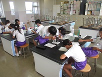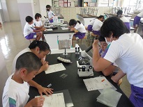 理科では、花粉の観察を行いました。顕微鏡を使って観察すると、細かく見ることができ、花粉の実際の形に驚いていました。