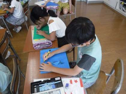 図画工作科では、「まどからこんにちは」の学習をしています。カッターを使って紙にいろいろな形の窓を作りました。安全に気を付けながら、おもしろい窓の形を見付けていました。
