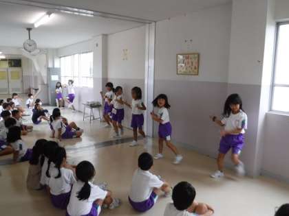 2年生は、音楽に合わせて踊るリズムダンスをしています。大きくのびのびと踊っている友達の様子を見て、「上手だね」「自分も真似をしてがんばりたいな」とみんなに伝えていました。友達と合わせて踊る楽しさを感じています。