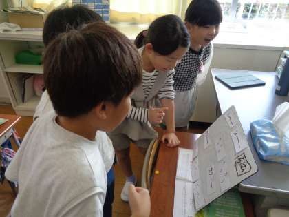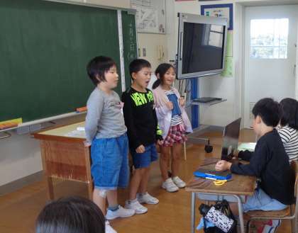 音楽で、身のまわりにある音を聞いて、それをもとに音楽作りをしました。それぞれが見付けた音を、班のみんなと組み合わせて作りました。音をどのような高さ・大きさにしようかや、何回同じ音を使うのかなどよく考えながら練習し、みんなと聴き合いました。