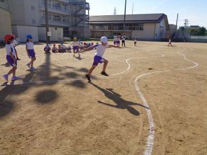 川跳び遊びでは、グラウンドに川に見立てて白線を引き、そこをジャンプで跳び越えました。川の幅をよく見て、自分が跳べそうなところから始め、少しずつ幅が広いところにチャレンジしていきました。