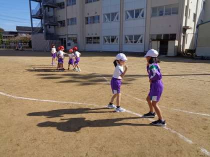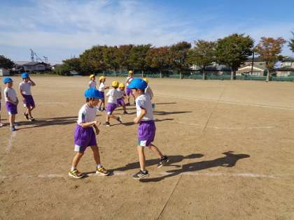 ドンジャンケンでは、白線の両端に色団ごとに並び、一人ずつ白線を進んでいきます。相手と出会ったところでジャンケンをし、勝った方は先に進めて、負けた方は元の場所に戻り、次の人がスタートするという遊びです。