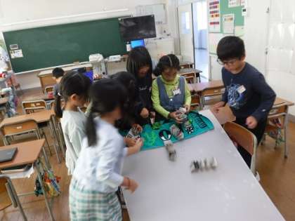 萩浦小学校には、わくわくタイムというまとまった休み時間があります。教室で何をしようか考えていた子供たちと一緒に、新聞紙を使ったうごくおもちゃ作りをしました。