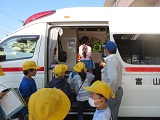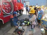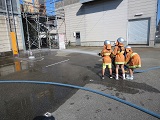「放水開始!」の合図で放水体験をしました。また、消防車や救急車を近くでたくさん見せていただきました。教科書では分からないことをたくさん勉強することができました。