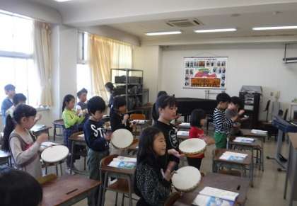 2年生は、音楽科で「リズムをかさねてたのしもう」の学習をしています。2拍子の曲「この空とぼう」と3拍子の曲「いるかはざんぶらこ」では、それぞれの拍を感じながら歌ったりリズム打ちをしたりしました。楽器の打ち方がだんだん上手になり、歌と合わせてリズムよく鳴らしていました。