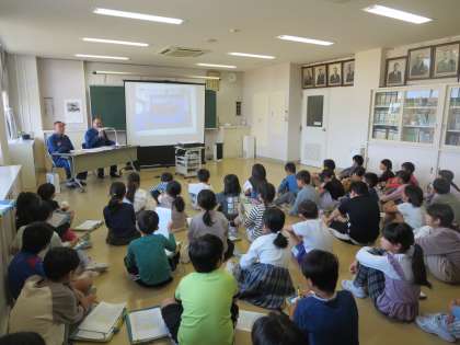 今日は、消防団の方を2名お招きして、消防団の取組についてお話を聞きました。昨日見学に行った消防署の消防士さんと消防団の方の違いや、これまでの経験等、分かりやすく教えていただきました。