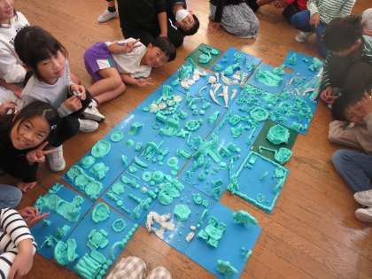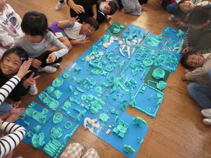 一人一人が粘土で町を作りつなげました。みんなの町をつなげたら大きな町ができました。「こんな町に住みたいな」「公園がたくさんあるよ」などと言いながらとても楽しそうでした。