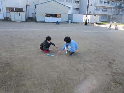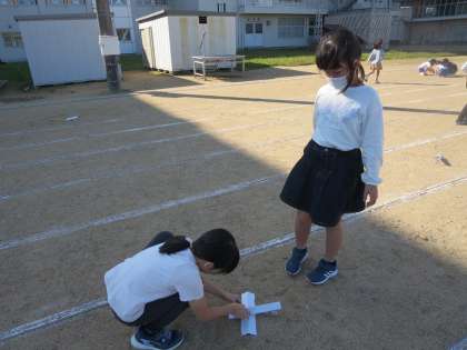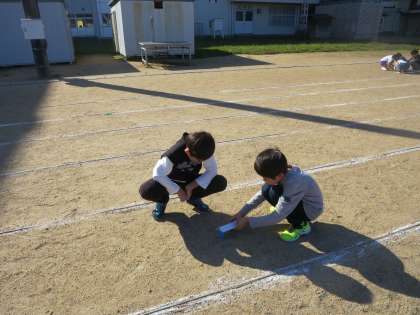 日なたと日かげの地面の温度を調べました。「絶対日なたの方が温かいよ」「午前中よりも午後の方が温かいと思う」などど予想をもって調べていました。
