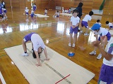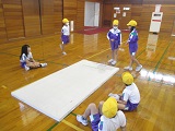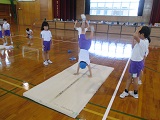 体育科では、マット運動に取り組んでいます。友達とアドバイスを出し合い、技の完成度を高めています。
