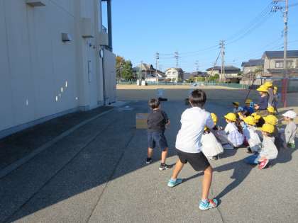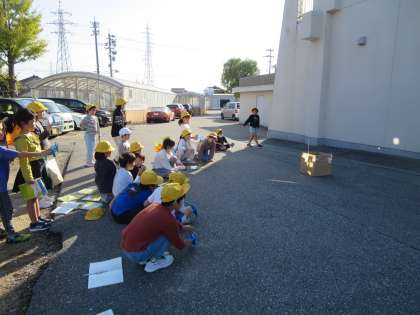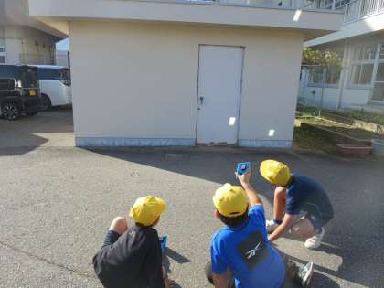 鏡ではねかえした光を的に当て、光を重ねた部分の温度を測ったり、手を当てて温かさを確かめたりしました。かげになっている地面に光の細い線や太い線を作ったり、光を動かしたりすることも楽しかったようです。