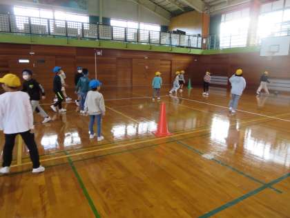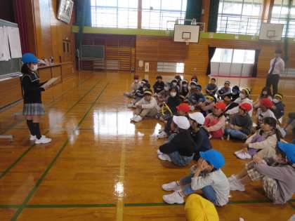 3年生と4年生がなかよくなろうという目当てで、交流会を企画しました。まず、線おにごっこをしました。体育館の線の上から落ちないように気を付けて走るのが楽しそうでした。次にドッジボールをしました。4年生が3年生にボールを譲ってくれる優しい姿が何度も見られました。3年生も4年生も仲良く楽しく思いやりながら遊べて大満足の交流会でした。