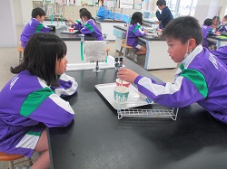 理科の学習では、空気や水をあたためたり冷やしたりすると体積が変化するかどうか調べています。試験管を使った本格的な実験に子供たちも真剣な様子です。今日は、水の体積の変化を調べました。空気ほど体積が変わらないことに驚いていました。