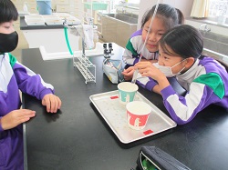 理科の学習では、空気や水をあたためたり冷やしたりすると体積が変化するかどうか調べています。試験管を使った本格的な実験に子供たちも真剣な様子です。今日は、水の体積の変化を調べました。空気ほど体積が変わらないことに驚いていました。