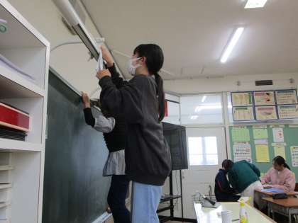 雨が続き、休み時間に教室で過ごす時間が多くなっています。今日は、普段掃除をすることがない黒板の蛍光灯や溝の汚れに気付き、今できることを考え自主的に掃除をする姿がありました。