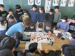 先日に引き続き、地域にお住まいの書道の先生に来ていただき、書き初めの練習を行いました。大事なポイントや細かい筆の使い方を直接教わりました。さらに今日は、目の前で書いているところを見せていただきました。前回よりもさらに上達しましたね。