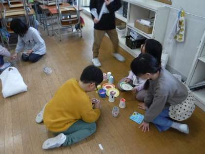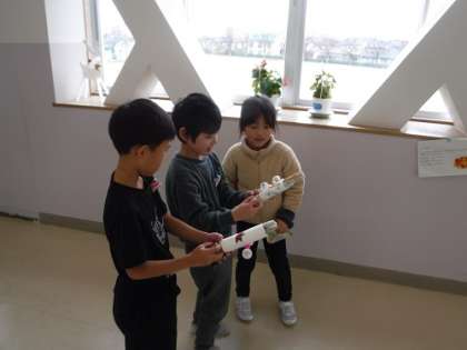 生活科では、ゴムや風の力、坂道を転がること等を生かして動くおもちゃ作りをしました。「より跳ぶようにしたい」「遠くへ飛ばしたい」「的に当てるゲームを作りたい」など、目当てをもって取り組みました。出来上がったおもちゃを使って、2年生みんなで遊びました。友達が作ったおもちゃのよさを見付け、伝え合っていました。