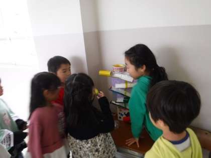 うごくおもちゃを作り、自分たちで遊んだ後は、1年生を招待したい!と張り切りました。1年生のクラスまで行き、「是非来てください」と呼びかけに行きました。