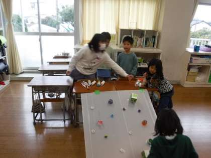 1年生が遊びに来て、作ったおもちゃで遊んでくれました。初めは恥ずかしそうにしていましたが、楽しそうに遊んでいる様子を見て、嬉しさを感じ、自分から話しかけることができるようになっていきました。