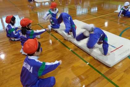 3学期最初に行う体育は、マット遊びです。約1年ぶりのマット遊びに、ドキドキワクワクした様子でした。