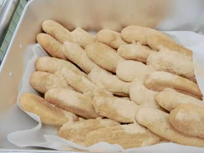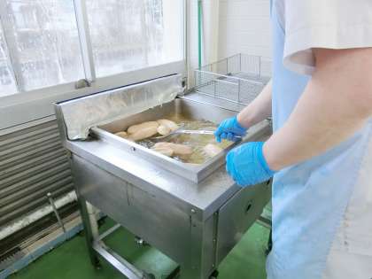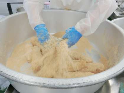 今日は、みなさんが楽しみにしていた「揚げパン」です。揚げパンが食べてみたいなという萩っ子の声が届き、今日は給食室で全校分のパンを揚げて、たっぷりのきな粉をかけておいしい揚げパンを作りました。