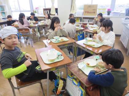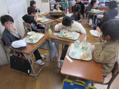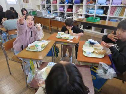 今日の給食は、あげぱんでした。給食であげぱんが出るのは初めてなので、みんな楽しみにしていました。「おいしい」「毎日あげぱんがいい」と嬉しそうに食べていました。