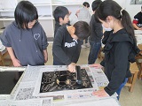 図画工作で作成中の版画の印刷を行いました。一生懸命彫った板にしっかりとインクをつけて、丁寧にばれんで写しました。各グループで協力しながら作業を進める様子も見られ、子供たちの成長を感じられる時間になりました。