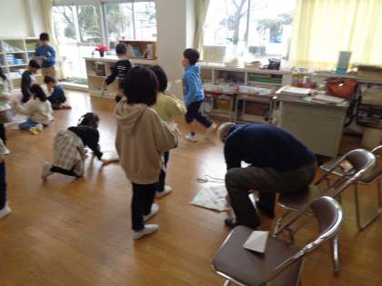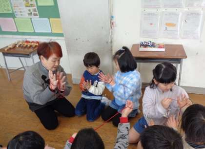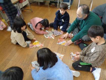あやとりや紙鉄砲、紙飛行機に挑戦。「僕の紙飛行機と名人の紙飛行機は作り方が違った」「名人の紙飛行機はよく飛ぶよ」など、気付いたことを話していました。