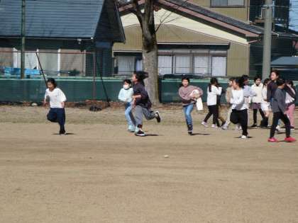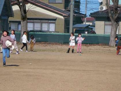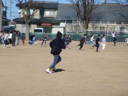 今日は春のような温かい日でした。休み時間になると、クラス全員がグラウンドに飛び出して行き、鬼ごっこをしていました。元気いっぱいの3年生です。