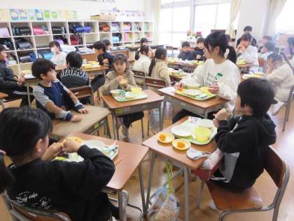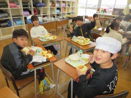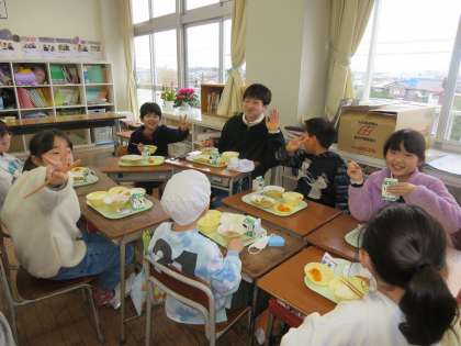 給食の時間に6年生が教室に来て一緒に食べました。おしゃべりが楽しすぎて「またきてね」と言っていました。