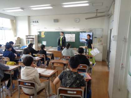 本年度着任された外国語専科の先生とALTによる、外国語の学習も始まっています。子供たちは、少し照れながらも、外国語に積極的に親しんでいます。