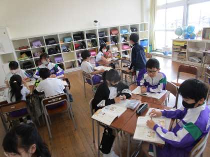 国語科の学習では、自分の名前を用いてあいうえお作文のような自己しょうかいを考えました。グループ活動では、まだ知らなかった仲間の一面を知り驚く子供たちもいました。