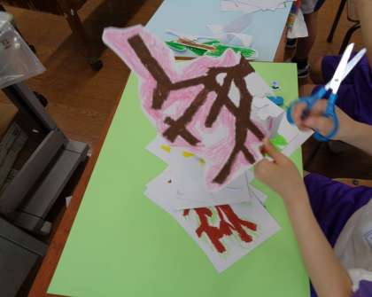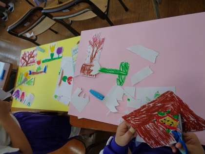 スケッチした春の花をはさみで切って、色画用紙に貼っていきます。自分の思うすてきな春を表現していきます。どんな春が完成するのかとても楽しみです。