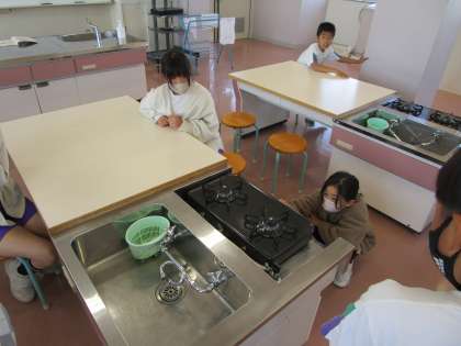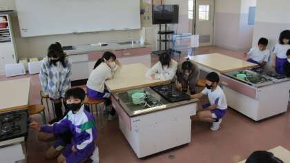 調理実習に向けて家庭科室の使い方を学びました。初めてガスコンロを扱う子供たちも安全な火の使い方を学んでいました。