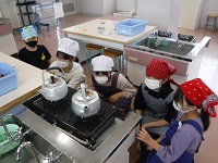 5年生の家庭科初めての実習でした。お湯を沸かしたり、急須を使ってお茶を入れたりしました。友達とやり方を確認し、安全に気を付けながら行いました。