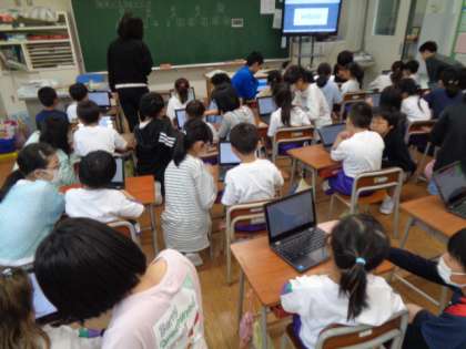 1年生が初めてクロムブックを使いました。ログインの仕方や操作の仕方を6年生が優しく教えていました。