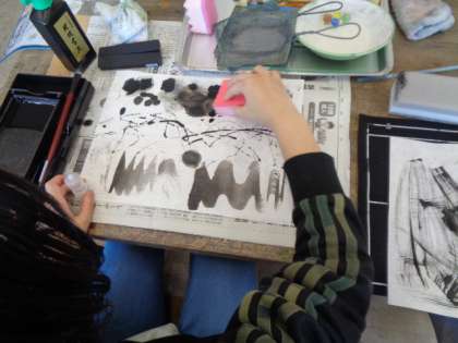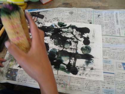 墨の可能性を探る題材をしました。墨の濃さを変えたり、筆以外の道具を使ったりして、どんな表現ができるかを試していきました。