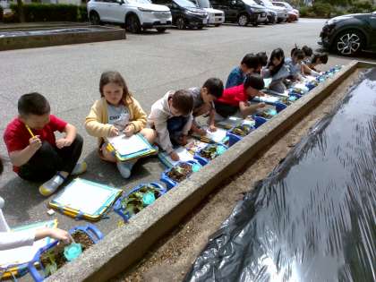 あさがおの種を植えてから、毎日一生懸命に水やりをしていた1年生。双葉が出たので観察を行いました。観察名人になろうと、目だけでなく手で感触を確かめたり、においを嗅いでいた様子が見られました。