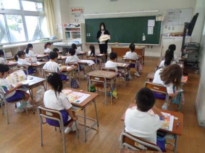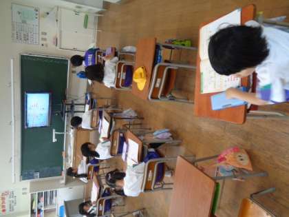 1組は算数、2組は図工。どちらの子供たちも先生の話をしっかり聞き、集中して取り組んでいます。