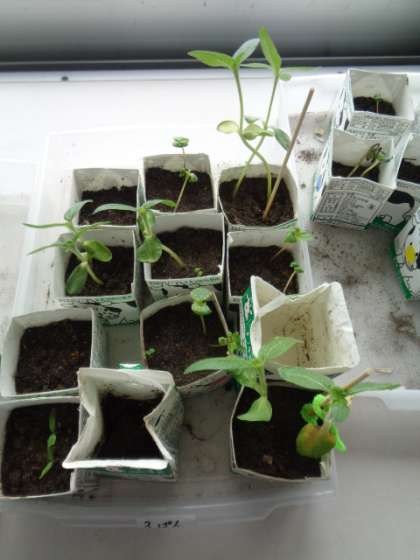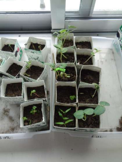 牛乳パックの中で、発芽した植物がぐんぐん生長しています。いろいろな植物があり、葉や茎の形や色、表面の様子などが違っています。これからどのように生長していくのか楽しみです。