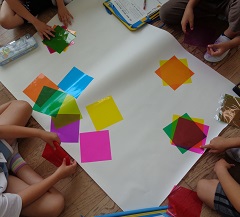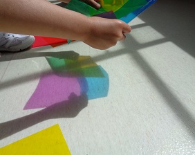 色セロハンを重ねて並べたり、重ね方を工夫したりして、いろいろな色を発見しました。「緑と黄色のセロハンを重ねると、光っている緑に見えたよ」「色を合わせると、いろいろな色ができることが分かったよ」「光に当てるとすごくきれい」などと、たくさんの発見をすることができました。