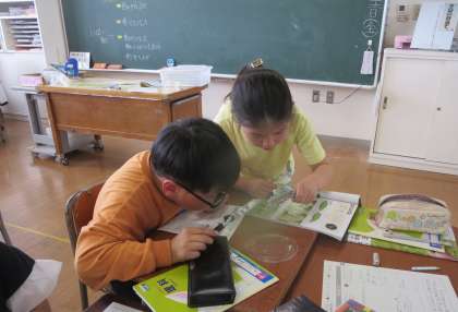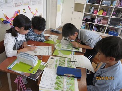 育てていたモンシロチョウの幼虫が、さなぎになりました。子供たちは動かなくなったさなぎの様子に興味津々です。虫眼鏡で観察していると、ちょうの羽の模様が見えてとても驚いていました。